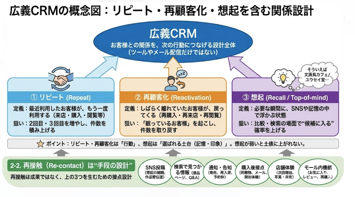 2. 広義CRMとは何か:リピートだけでなく「再顧客化・再接触・想起」まで含める