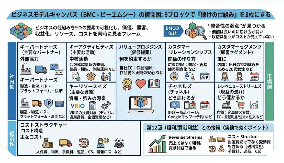 • BMCは、価値・顧客・収益・活動・コストを9ブロックで1枚に統合し、「儲けの仕組み」の整合性を見るモデル。