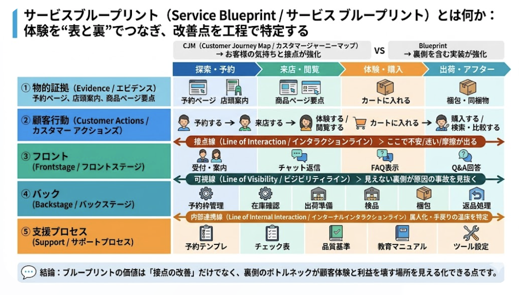 CJMが「お客様の気持ちと接点」を強くするのに対し、ブループリントは「裏側を含む実装」を強くします。