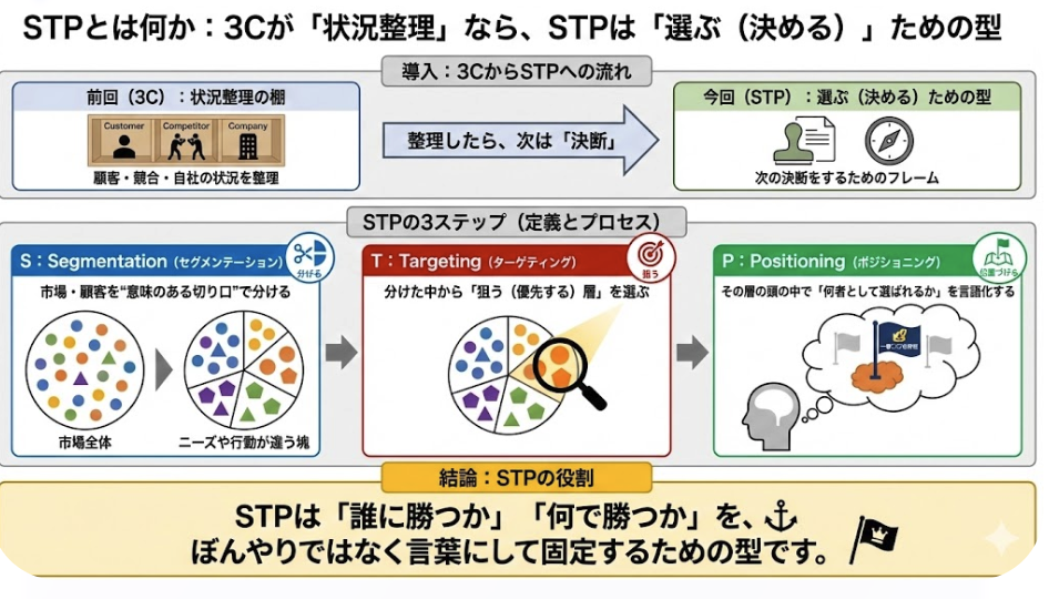 2. STPとは何か:3Cが「状況整理」なら、STPは「選ぶ(決める)」ための型