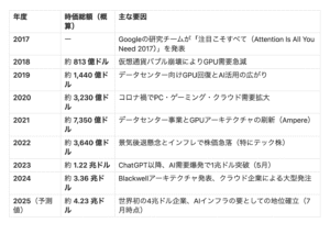 最高性能のGPU生産技術をもつアメリカのNVIDIA(エヌビディア)は、この流れによって歴史上初の4兆ドル企業にまで成長。(つまりGAFAM、GoogleとかAmazonとかappleとかより巨大)